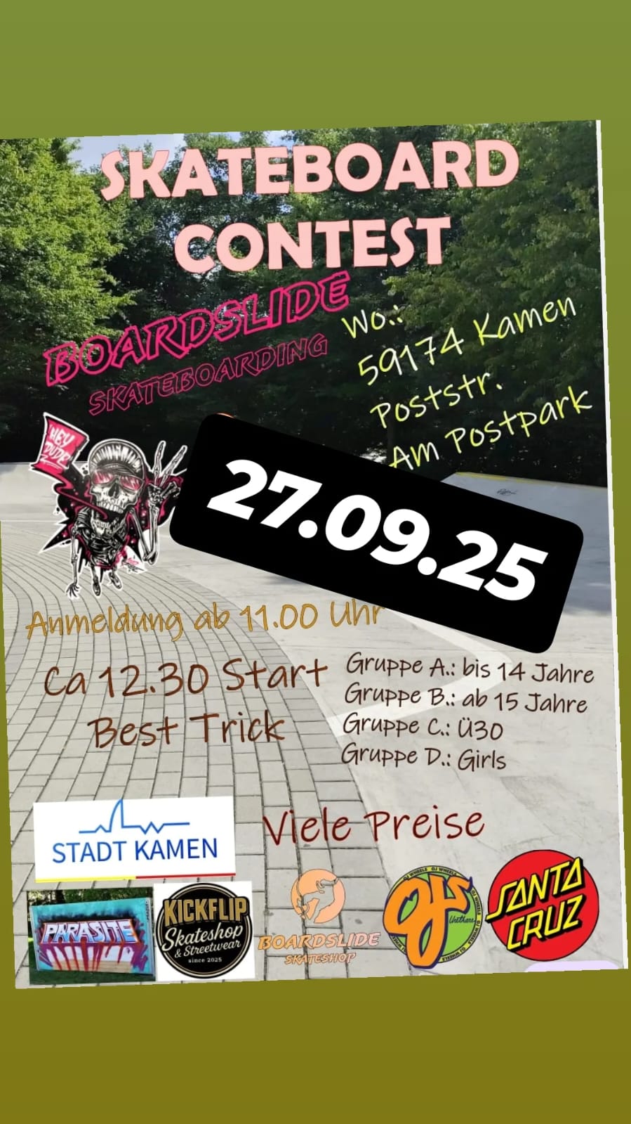 Nach erneuter Rücksprache mit dem durchführenden Skateshop „Boardslide“ aus Werne / Max(imilian) Wingenfeld und Ferit Altas vom JKC, wurde nun der Skatecontest kurzfristig für den 27.09.2025 verabredet. Das Wetter soll wohl nun mitspielen und trocken sein / bleiben. Der diesjährige Skatecontest findet erstmalig für 4 NutzerInnengruppen statt